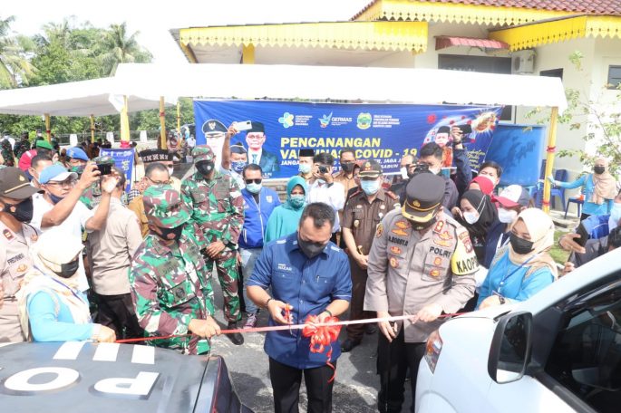 Polres Lingga Daerah kepulauan Riau Lakukan Pengamanan Pencanangan Vaksinasi Covid-19 di Gedung Daerah Dabo Singkep Kabupaten Lingga, Senin ( 1/2/2021). Dalam Kegiatan Pencanangan Vaksinasi di Gedung Daerah Dabo Singkep dihadiri Plt. Bupati Lingga M. Nizar, S.Sos, Kapolres Lingga AKBP Arief Robby Rachman, S.H, S.I.K, M.Si, Danlanal Dabo Singkep LETKOL Laut (P) Didik Hermawan, M.Tr.Opsla, Pabung…